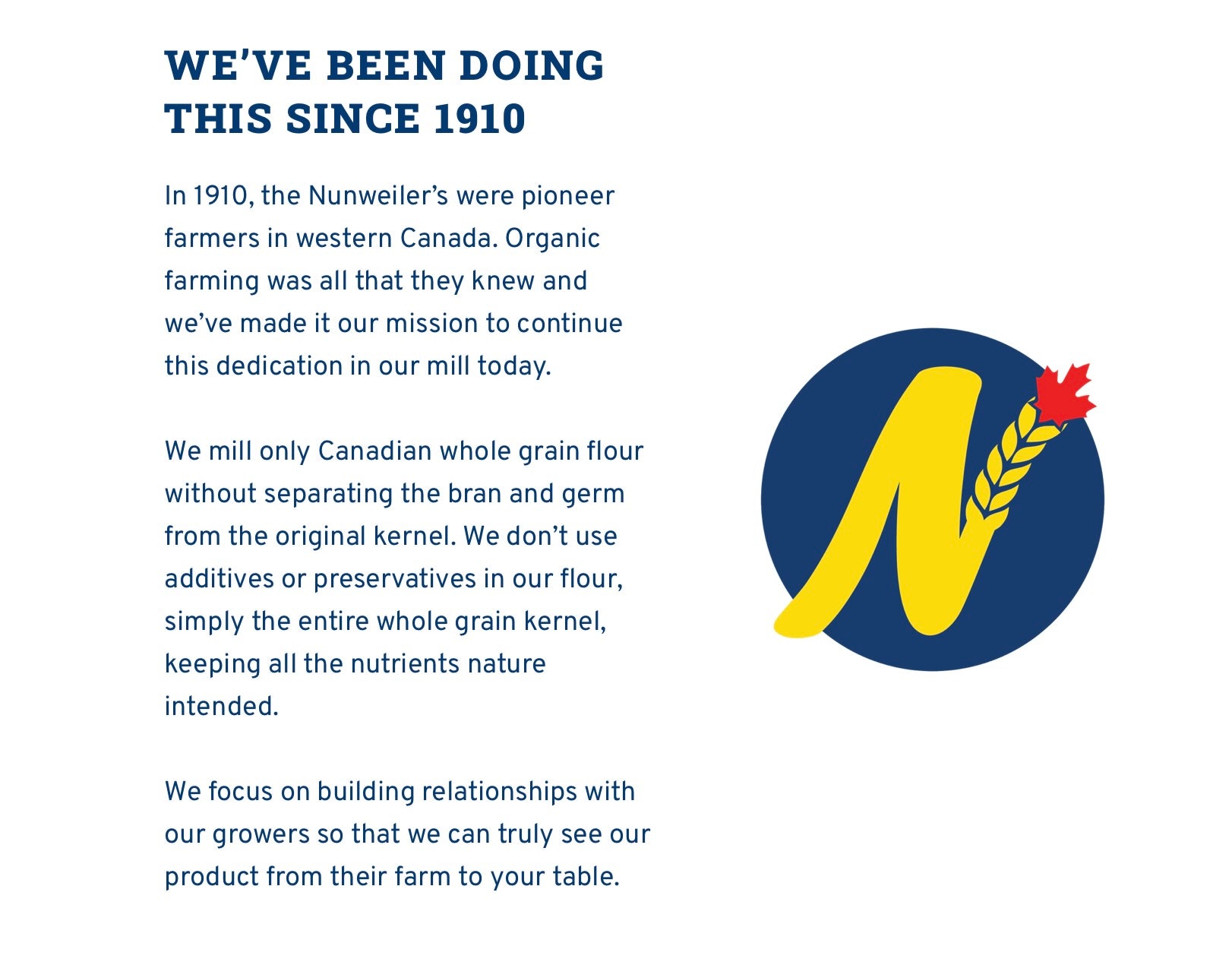 Since 1988, Nunweiler's Flour Company have been milling whole grain flour without separating the bran and germ from the original kernel. NO additives or preservatives are used in the flour, simply the entire whole grain kernel, keeping all the nutrients nature intended